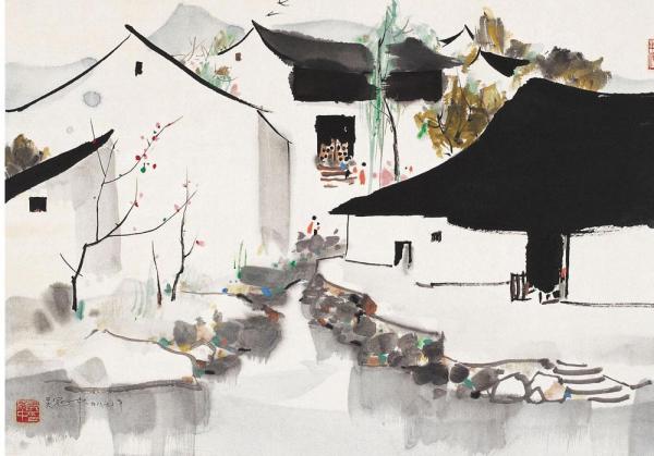 在滿足了基本需求后,孟浩凡才開(kāi)始考慮,如何為這座古鎮(zhèn)保留傳統(tǒng)江南民居的神韻,又體現(xiàn)出現(xiàn)代學(xué)的美感和創(chuàng)意。他想到了畫(huà)家吳冠中。孟浩凡說(shuō),比起具象的元素,他更多考慮的是保留“氣質(zhì)”?!氨热缯f(shuō)你看這色調(diào),色調(diào)是白墻綠瓦,中間有一些灰色系的這種磚,都是老色調(diào)的基底給我們的感覺(jué)。這種壓頂?shù)木€條,像吳冠中的畫(huà),都是很抽象的嘛。畫(huà)江南民居,他畫(huà)出來(lái)很抽象的藝術(shù)畫(huà),沒(méi)有具象的符號(hào),但是你一看這個(gè)東西它就是江南的,因?yàn)槲蓓數(shù)倪@種曲線、線條,勾勒出了江南的這種俊秀?!?/p>