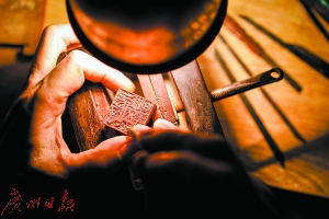 顧名思義,疊字印就是在印章的字上再刻字,下面的字細(xì),上面的字粗?!翱桃粋€(gè)疊字印要兩天,如果是比賽的話,一個(gè)小時(shí)左右就能搞定。”項(xiàng)頌秋說。