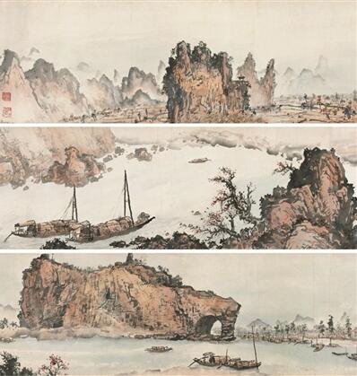 關(guān)山月白天外出寫生,晚上整理寫生畫稿,獲得了一大批寫生作品。秀美的桂林山水激發(fā)了他的創(chuàng)作熱情,引發(fā)了他的創(chuàng)作靈感,他覺得應(yīng)該進行大的創(chuàng)作,把百里漓江兩岸勝景盡收畫卷之中。但是,他所住的七星巖公寓,又小又暗,只有一張小桌子,施展不開。而且,他還欠了一大筆租金,住不下去了。幸好得到李焰生的幫助,住進其家,得以在李家的客廳里作畫,桌子不夠?qū)?,他就把紙鋪在地板上蹲、趴著畫。奮戰(zhàn)了月余,終于完成了一幅32.8厘米×2850厘米的長卷《漓江百里圖》,開創(chuàng)了廣西的“漓江畫派”風(fēng)格。