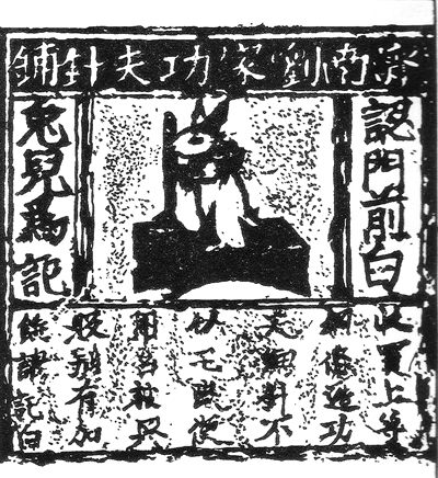 “濟(jì)南劉家功夫針鋪”銅雕版的驚人之處還在于,它是用動物形象作為商業(yè)廣告的最早實例。玉兔搗藥是與嫦娥奔月有關(guān)的傳說,民間流傳有多種版本,此處商家選用白兔作為商標(biāo)的初衷耐人尋味,有人猜測是因為玉兔搗藥所用的鐵杵讓人聯(lián)想到鐵杵磨成針的典故。