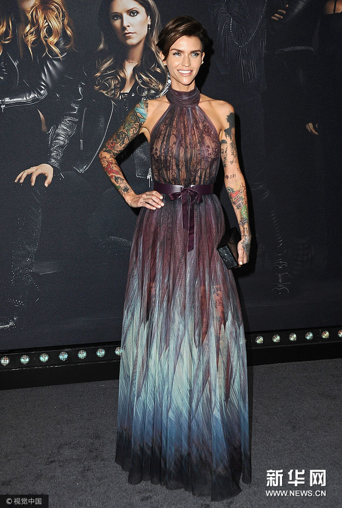 ??? 近日,美國(guó)好萊塢,眾明星參加電影《完美音調(diào)3》首映禮。 魯比·洛斯(Ruby Rose)身穿漸變深紫色削肩掛脖透視蕾絲紗裙,系紫色腰帶,手拿黑色亞克力手拿包。