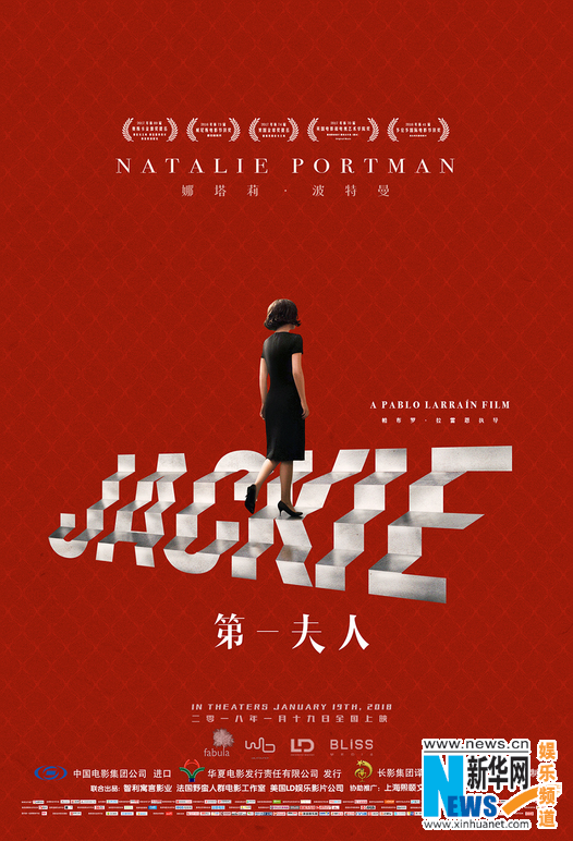 此次曝光的海報巧妙喻示了肯尼迪遇刺后總統(tǒng)夫人杰奎琳的人物心理狀態(tài)。海報中由娜塔莉·波特曼,在由自己名字組成的階梯上艱難攀登,一席黑色連身裙整潔樸素,在鮮紅色的背景中顯得孤獨神秘,同時也暗藏危機,雖背影示人,但讀出了優(yōu)雅自信,似乎已放下內(nèi)心的秘密與束縛,坦然面對命運帶來的一切。