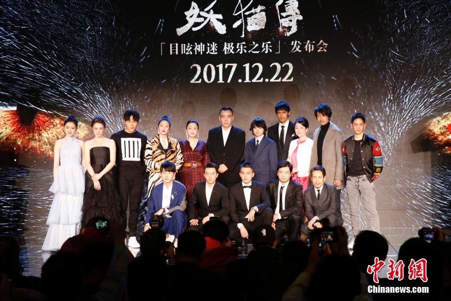12月17日,由陳凱歌導演的賀歲奇幻題材電影《妖貓傳》在北京舉行全球首映發(fā)布會,導演陳凱歌,制片人陳紅攜主演黃軒、染谷將太、張雨綺、秦昊、張榕容、張魯一、劉昊然、阿部寬、松坂慶子等亮相。影片改編自日本作家夢枕貘的魔幻系列小說《沙門空海》,將于22日起在中國內(nèi)地上映。圖為眾主創(chuàng)合影。