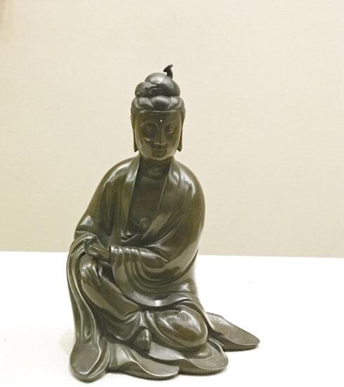 其中,最引人注目的莫過于展覽海報上呈現(xiàn)的“景德鎮(zhèn)白釉瓷塑觀音菩薩像”,產(chǎn)于南宋時期,整尊瓷塑構思既簡約又精巧,以粗線條捏塑形體與衣紋,胸前瓔珞精致,人物形象傳神,充分展現(xiàn)了宋代瓷塑藝術的審美意韻與高超技藝。令人嘖嘖稱贊的還有明中晚期的“銅觀音菩薩像”。此像采用暹羅國(今泰國)所貢優(yōu)質風磨銅鑄造,工藝精細,撫之如嬰兒肌膚,嵌銀絲,背后銀絲鑲嵌方章銘款“石叟”二字,當出自石叟本人之手。據(jù)了解,石叟為明代晚期鑄銅塑像名匠,僧人身份,現(xiàn)存中晚明觀音銅像中尚有部分“石叟”款,真品珍貴稀罕。