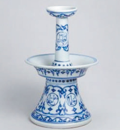 這是一件明正德年間的青花燭臺。燭臺很復雜,由四部分組成,最上端為蠟燭插口,外壁繪如意云頭紋;其下為燭臺細長支柱,中部繪圓形開光,開光內書寫阿拉伯文,上下分別繪勾蓮花枝紋及菱形紋。再下為承托圓盤,也繪如意云頭紋;最下端為喇叭形臺座,也繪圓形開光,開光內書寫阿拉伯文,開光上下分別繪勾蓮花枝紋及菱形紋。燭臺上的阿拉伯文與傳統(tǒng)紋飾,表現(xiàn)出阿拉伯文化與中華傳統(tǒng)文化的交融。