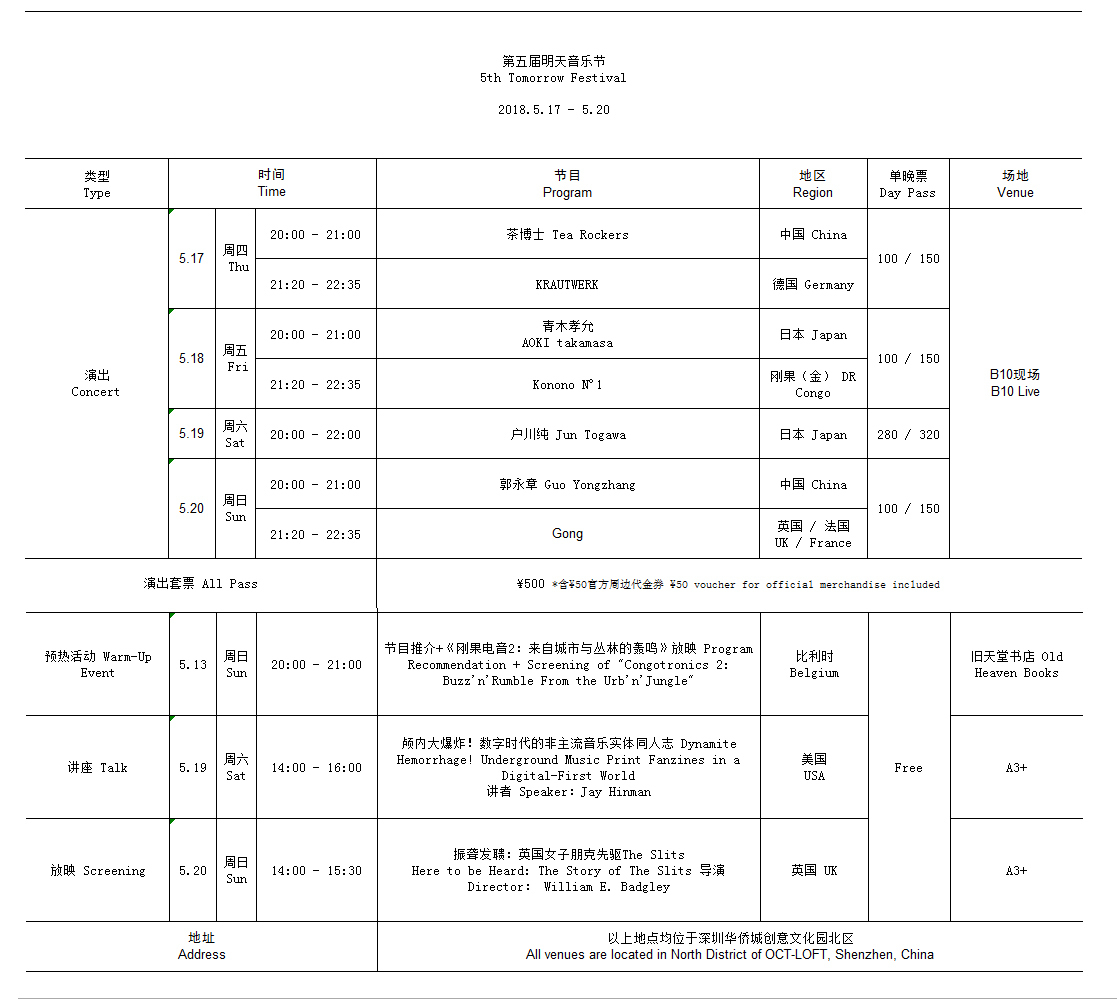 深圳新聞網(wǎng)訊 五月既至,好事即將發(fā)生。由深圳華僑城創(chuàng)意文化園主辦的第五屆明天音樂節(jié)將于2018年5月17日至20日在B10現(xiàn)場舉行。本屆明天音樂節(jié)作為“有形無界”華僑城創(chuàng)意文化園文博會分會場系列活動的重點項目,將邀請來自6個國家的7組音樂家/藝術(shù)家,呈現(xiàn)包括演出、講座、紀錄片放映在內(nèi)的多元節(jié)目。除此之外,策展人將于5月13日在舊天堂書店做節(jié)前預熱,屆時會有節(jié)目介紹環(huán)節(jié)和一場完整的放映活動。