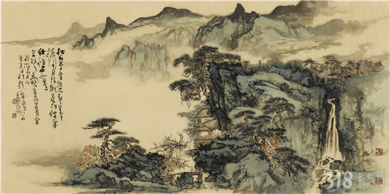 范陽先生的山水畫,筆法近取傅抱石、黃秋園,遠(yuǎn)溯“元四家”中黃公望、王蒙。筑居楊岐山下,使先生日夜親近自然山水,吐納天地,養(yǎng)浩然之氣?!巴鈳熢旎?,中得心源”,唐代張璪一言道破了山水畫家修養(yǎng)、悟性的不二法門。范陽先生正是以自然(造化)為營養(yǎng),入而為心靈化育,镕冶成亦古亦新,遠(yuǎn)離塵俗的獨特風(fēng)格。近作《松風(fēng)泉聲》(五屏聯(lián))氣勢磅礴,大開大合,細(xì)究又十分謹(jǐn)嚴(yán)。筆墨與丘壑融為一體,既豪放又穩(wěn)健。淺絳青綠的設(shè)色,使畫面有蔥翠欲滴之感??胺Q山水畫中的經(jīng)典。