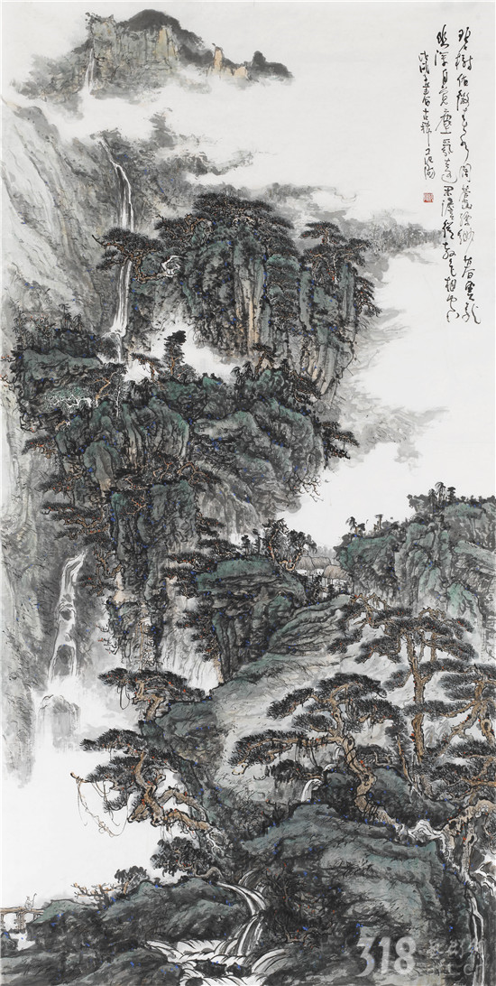 細(xì)品范陽先生的山水,可見他筆墨古厚,意境清新,深得宋元意蘊的滋養(yǎng),尤對王蒙豐茂繁密的畫風(fēng)有著獨特的理解,于“四王”的筆墨和圖式也諳熟于心。峰巒嵯峨,溪泂蜿蜒,云霧纏繞,松柏掩映,屋舍儼然,這是范陽筆下常見的山居主題。這些景致,既源自于他隱居楊岐山的生活體驗,也來自于他對古人山水畫筆墨圖式的不斷玩味、整合,從而構(gòu)成了他理想的山水圖景。不難理解,階段性選擇隱居山林,遠(yuǎn)離喧囂的都市生活,這兩種互補的生活模式為范陽的山水畫帶來了更深層次的思考——傳統(tǒng)與現(xiàn)代、山林與都市之間如何尋求個人心境與藝術(shù)語言的統(tǒng)一。