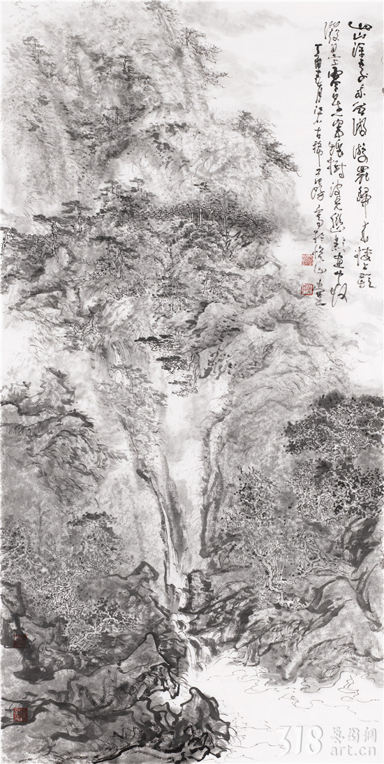 我以為,范陽先生是真正在心性上貼近古人“不下堂筵,坐窮泉壑”,其現(xiàn)居贛中名岳武功山、楊岐山之中。尤其武功山,史上與衡山、廬山并稱江南三大名山,被冠以“衡首廬尾武功中”,山脈綿延浩瀚,茫茫無際。范陽先生終日面山臨壑,弄筆自適,得武功真容。山水畫從來就不是簡單的描摹自然的風(fēng)光,無論丘園養(yǎng)素還是泉石嘯傲,都是畫者精神的自然流露,這是畫家筆墨情態(tài)的表達(dá),亦是畫家藝術(shù)境界追求的體現(xiàn)。對于山林的描繪,承載了畫者對泉石意趣的向往,對于林下境界的追求。范陽先生的山水畫作品長于布景,對山中的“陰、晴、朝、夕”的細(xì)膩描繪都有他自已獨特感悟和表達(dá)。筆下極丘壑浩渺之勢,奇峰羅列,宛有風(fēng)骨,深壑幽谷,其勢超峻;至于松柏掩映,峭壁涌泉,野道幽麓,于野逸之態(tài)甚備。范陽先生數(shù)十年來遍臨南北宗諸家,遠(yuǎn)溯元人四家,清初四王,近至黃秋園,上下求索,崇穆有加,最終歸皈真逸正脈。新近年逾七十之作,日漸精熟,蒼腴古厚,更趨融古化古之態(tài),細(xì)究其筆下蹤跡:子久?麓臺?秋園?各不相肖,而莫不精備。諦觀其中景象:匡廬?武功?羅霄?渾然而化,不一而足。如此境地當(dāng)稱“妙解”。