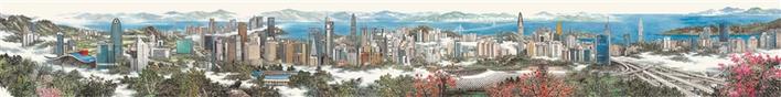 《深圳盛景圖》的創(chuàng)作分三段進(jìn)行。第一段《梧桐山下盡朝暉》用中國傳統(tǒng)藝術(shù)繪畫手法,以梧桐山山脈蜿蜒的東部華僑城、仙湖植物園和蓮花山入畫;第二段《深圳特區(qū)沐春風(fēng)》用中國當(dāng)代創(chuàng)作手法與獨(dú)特的留白技巧、現(xiàn)代與西方畫法的精準(zhǔn)結(jié)合,全景式展現(xiàn)深圳特區(qū)在金融、信息、文化、科技等方面取得的輝煌成就;第三段《展望未來繪新圖》中,蛇口港林則徐禁煙的古炮臺依舊敘述著深圳過往的歷史,而以蛇口海上世界、前海、機(jī)場、碼頭、港口、集裝箱貨運(yùn)吊車為主的城市高速物流產(chǎn)業(yè)與城市建設(shè)相呼應(yīng)。