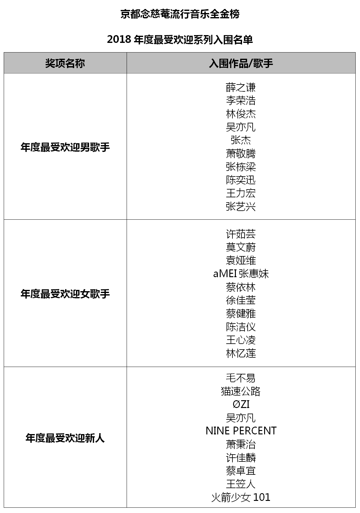 “年度最受歡迎樂隊/組合”入圍名單中,同在2018年成功舉辦巡回演唱會的五月天、S.H.E等老牌組合的進(jìn)榜,讓大家看到了華語樂壇常青樹的非凡音樂實力;八三夭、C.T.O、BBT、FS Fuying&Sam、頑童MJ116等組合,憑借不減反升的人氣魅力實力進(jìn)榜;而NINE PERCENT、火箭少女101及貓速公路等新人組合的二次入圍,不僅僅是對他們在音樂成績上的肯定,更是對其未來之路的鼓勵。