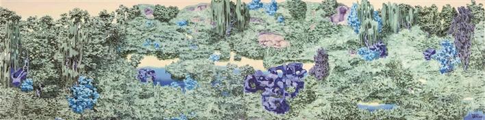扈海風(fēng)的繪畫,呈現(xiàn)出一種介于中國水墨與西方架上藝術(shù)之間的視覺效果,具有中國水墨的時空韻腳。扈海風(fēng)用近乎絲網(wǎng)印刷的平涂手法,對幾個具有中國元素的形象符號展開審視。那些原本存在于古典語境中的符號經(jīng)歷復(fù)制、重疊等過程而被重塑,還原成山水或風(fēng)景,成為藝術(shù)家筆下的“中國花園”。