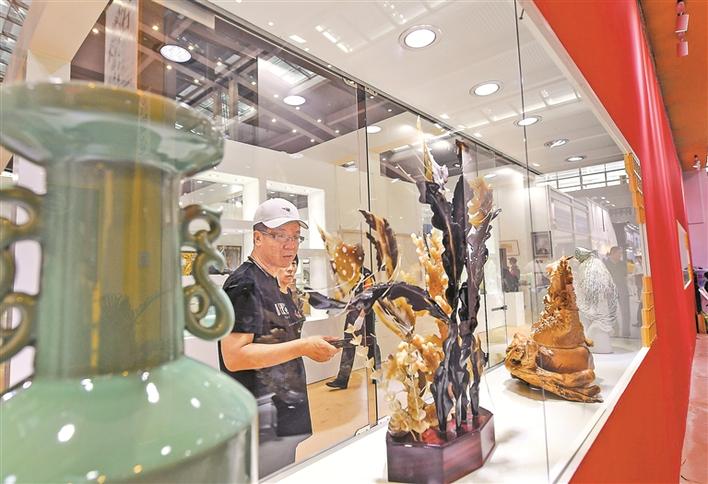 在9號館的5592平方米的場地上,精致的生活器具、體量龐大的玉雕、惟妙惟肖的根雕以及各式各樣的藝術(shù)精品都在講述著背后的匠人故事。