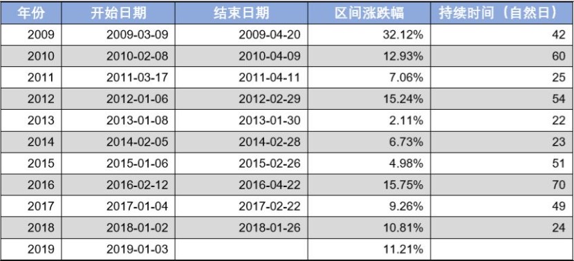 從以上統(tǒng)計(jì)數(shù)據(jù)可以明顯看到春季躁動(dòng)的存在,但是持續(xù)的時(shí)間和區(qū)間漲跌幅有明顯的差異,持續(xù)時(shí)間最短的是2018年,一共24個(gè)自然日,最長的是2016年達(dá)到70個(gè)自然日。漲幅最小的是2013年,僅僅上漲2.11%,效果最不明顯。
