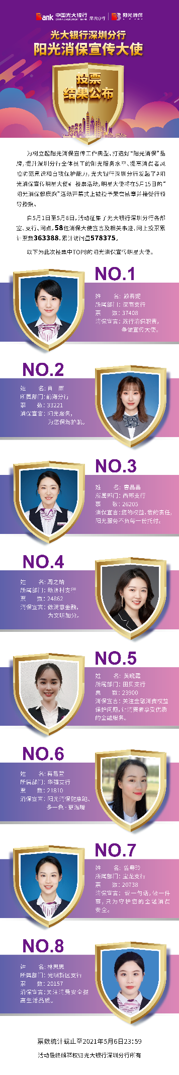 深圳新聞網(wǎng)·見圳客戶端2021年5月8日訊 昨日,光大銀行深圳分行“陽光消保宣傳明星大使”線上投票圓滿結(jié)束,從58名宣傳大使中投票產(chǎn)生了賴春妮、肖雨、曹晶晶、周之靖、黃曉霞、蔣易萱、曾粵玲、林思思8名陽光消保宣傳明星大使。明星大使將在5月15日的“陽光消保健康跑”活動(dòng)開幕式上被授予榮譽(yù)勛章并接受行領(lǐng)導(dǎo)授旗。5月1日,光大銀行深圳分行發(fā)起了“陽光消保宣傳明星大使”線上投票,旨在樹立起陽光消保宣傳工作典型,打造“陽光消?!逼放?,提升深圳分行全體員工的陽光服務(wù)水平,提高消費(fèi)者風(fēng)險(xiǎn)防范意識(shí)和自我保護(hù)能力,提升光大在深圳地區(qū)的品牌影響力。投票活動(dòng)得到社會(huì)熱烈響應(yīng),據(jù)統(tǒng)計(jì),此次累計(jì)票數(shù)達(dá)363388次。