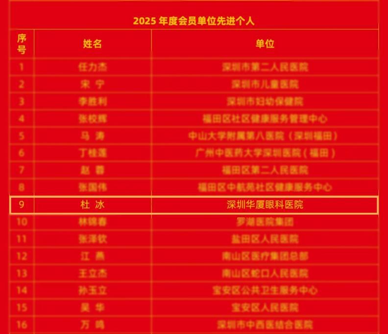 深圳新聞網(wǎng)2026年1月29日訊(記者 林恒鑫)1月27日,深圳市社區(qū)衛(wèi)生協(xié)會(huì)公布了2025年度優(yōu)秀分支機(jī)構(gòu)及先進(jìn)個(gè)人名單,深圳華廈眼科醫(yī)院副院長(zhǎng)杜冰教授因在社康眼健康服務(wù)中的突出表現(xiàn),榮獲“2025年度會(huì)員單位先進(jìn)個(gè)人”稱號(hào)。
