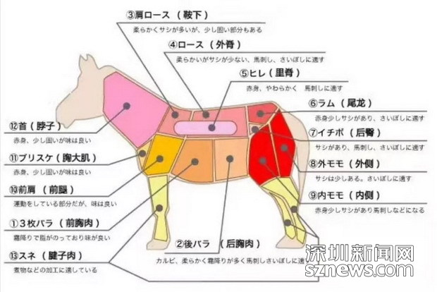 馬能做成刺身的部位相當(dāng)?shù)挠邢蓿勒沼突ǚ植即笾驴梢苑譃楦谷?卜口)、霜降、赤身等不同的等級。其中最稀有的的“三枚腹”肉,一匹五百公斤的馬只能產(chǎn)出大約5-6公斤,肉質(zhì)口感近似于藍(lán)鰭金槍魚中腹肉。
