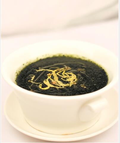 首先將菠菜飛水,再用料理機(jī)打成蓉,可以整棵菠菜放入料理機(jī),不會浪費(fèi)“紅根”。然后在平底鍋用豬油將菠菜蓉推開,最后放入雞湯煮沸,加入幾片火腿絲就可以上桌。為什么要加入豬油呢?周師傅解釋說,因?yàn)椴げ巳绻环庞偷脑?會比較“糠”(粵語),用豬油推開后羹就變得又滑又香。