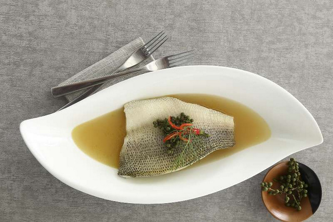 區(qū)別于充斥著辣椒與熱油的傳統(tǒng)水煮魚,梧桐 PLUS 的 fusion水煮魚外表清新,口感麻辣。食材選用三斤左右的上等淡水鱸魚,清晨宰殺,剔骨后整場(chǎng)取肉,再經(jīng)過高溫蒸制,保證魚肉肉質(zhì)嫩滑松軟。并不像傳統(tǒng)的水煮魚采用的“湯菜”的方式,fusion水煮魚采用肉料分離的烹飪方式。魚湯經(jīng)過麻椒、辣椒的熬煮而變得味道濃郁,過濾后僅留清爽的湯汁,單從視覺上根本無(wú)法判斷蘊(yùn)藏的奇妙味道,這也正是這道招牌菜的精妙之處。盛盤后的fusion 水煮魚猶如一道藝術(shù)品,造型簡(jiǎn)約充滿意境,清亮的魚湯入口瞬間酸辣感通透口腔,脫離了紅油浸泡的濃郁麻辣口感,更加健康養(yǎng)生。