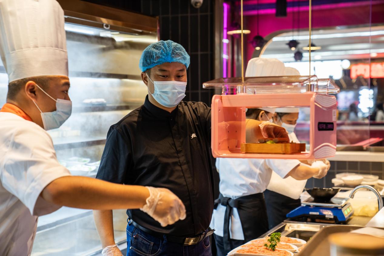 值得一提的是,除了地道的火鍋美食,這家餐廳的特別之處,在于高科技智能機(jī)器人的廣泛應(yīng)用。在餐廳過道里,一款名為“蠶豆”的配送機(jī)器人來回奔忙,把各式菜品有條不紊地送達(dá)顧客桌前。半空中,高效穿梭的云軌小車將菜品傳送到餐桌,“從天而降”呈現(xiàn)在顧客面前,科技體驗感十足。這款“天降”智能云軌傳輸系統(tǒng),由智能配餐、智能云軌兩大模塊構(gòu)成。顧客通過手機(jī)下單后,智能配餐系統(tǒng)接到指令,能自動將相應(yīng)菜品餐食分配給云軌小車,高效、快速地配送到對應(yīng)餐桌,整個送餐過程實(shí)現(xiàn)“零接觸”,在高效率的同時,確保了安全衛(wèi)生。