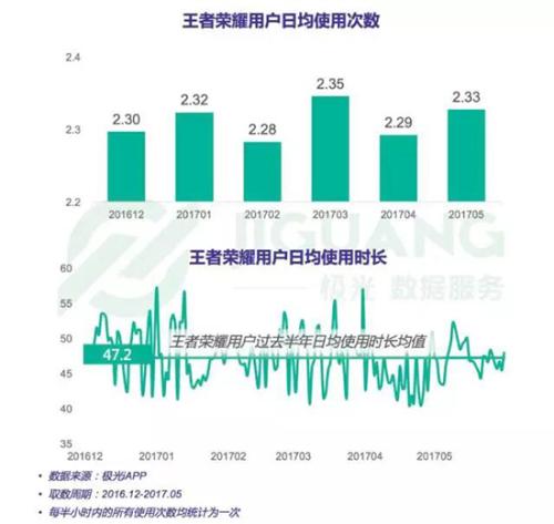 根據(jù)極光大數(shù)據(jù)的統(tǒng)計(jì),《王者榮耀》用戶白天游戲高峰時(shí)段為12:00-13:00,占比為6.97%;晚間游戲高峰為21:00-23:00,共占比13.63%在過去的半年里《王者榮耀》日均使用次數(shù)在2.3次左右,日均使用時(shí)長基本在40~55分鐘這一區(qū)間。從此處來看,其用戶使用情況并沒有達(dá)到一個(gè)與常規(guī)游戲差異巨大的程度。