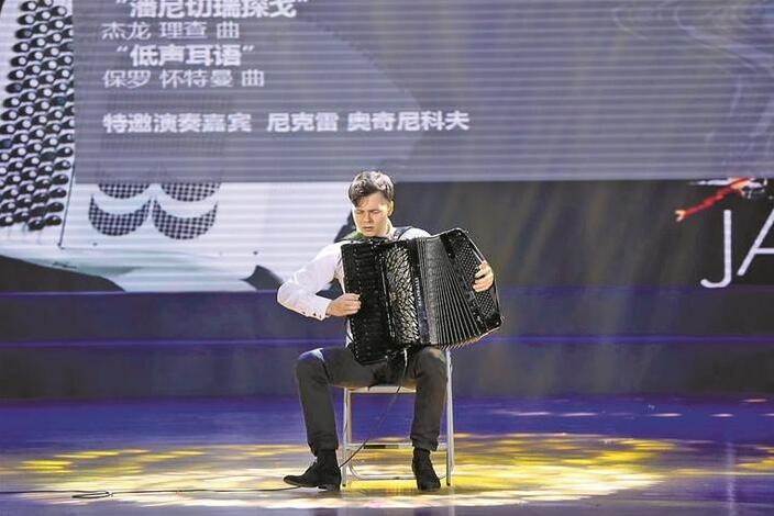 ▲俄羅斯青年手風(fēng)琴演奏家尼科雷·奧奇尼科夫現(xiàn)場演奏。