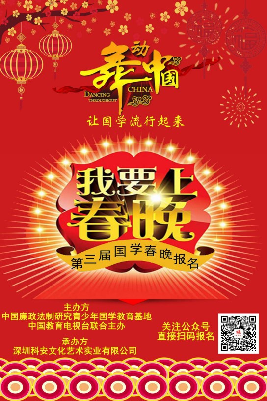 2019年第三屆國學(xué)春晚由青少年國學(xué)教育基地與中國教育電視臺(tái)聯(lián)合主辦,本次春晚打破以往以晚會(huì)為主導(dǎo)的籌辦模式,更注重國學(xué)文化的推廣及全民國學(xué)才藝的選拔。首次以主辦方的報(bào)道與宣傳規(guī)模在全國范圍內(nèi)進(jìn)行海選。以“舞動(dòng)中國”為主題在全國范圍內(nèi)進(jìn)行強(qiáng)勢(shì)推廣,發(fā)出中國國學(xué)文化領(lǐng)域的最強(qiáng)音!在長達(dá)4個(gè)多月的宣傳活動(dòng)期間,將不間斷運(yùn)用活動(dòng)背景、輻射人群、媒體資源、賽事平臺(tái)及網(wǎng)絡(luò)優(yōu)勢(shì)等方式弘揚(yáng)國學(xué)。
