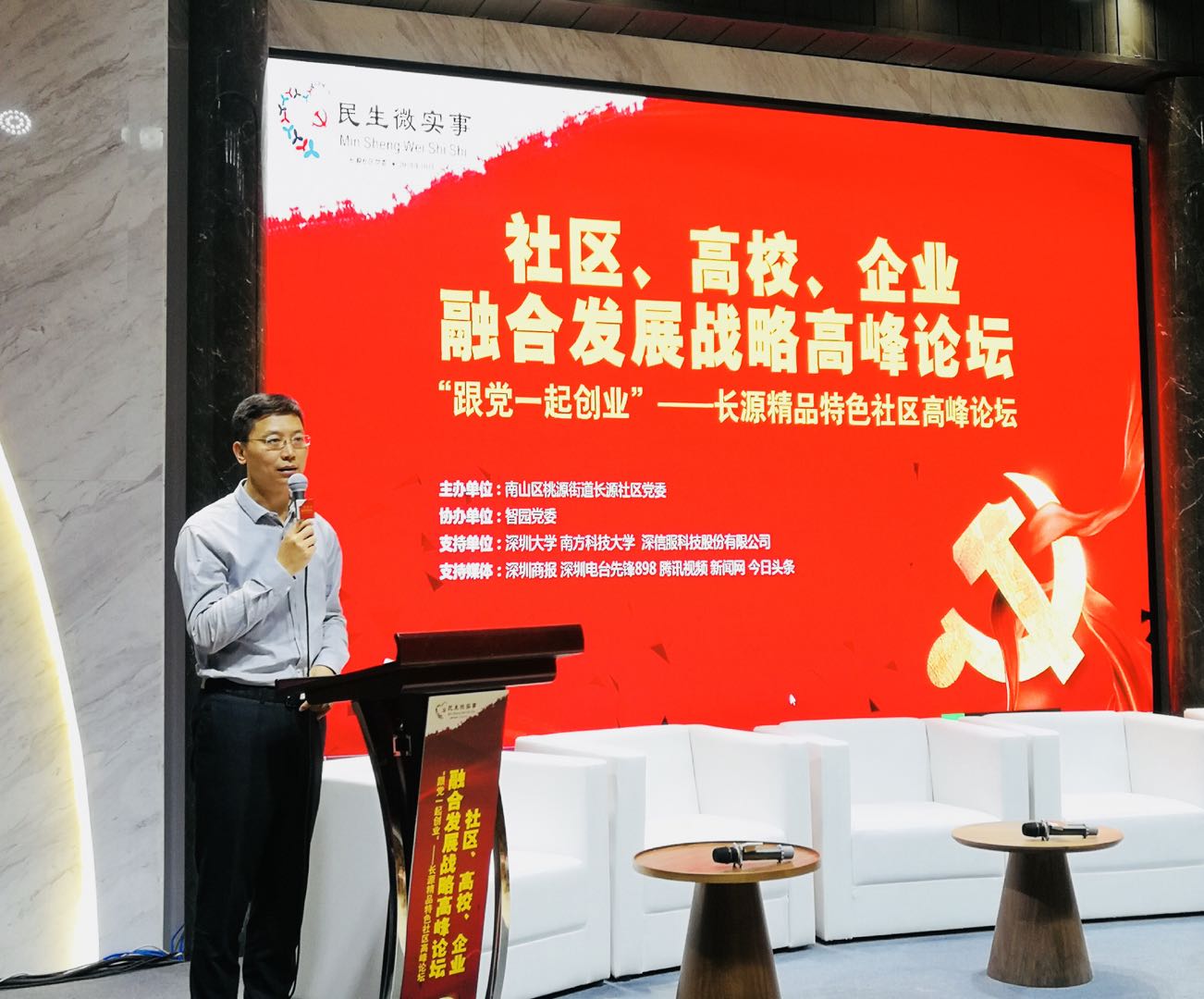 桃源街道黨工委書記黃健表示,本次論壇是智園黨群服務(wù)中心正式開放以來的第一場大型活動,桃源街道黨工委將努力把這里打造成為“一中心兩平臺”,即社區(qū)、校區(qū)、園區(qū)“三區(qū)融合”展示中心,北部片區(qū)園區(qū)黨群服務(wù)平臺,資源共建、共享、共治的對接平臺,把智園和長源片區(qū)打造成為“三區(qū)融合”的典范。嘉賓易松國作為主講嘉賓,進(jìn)行了《共建、共治、共享視角下的社區(qū)融合》主題演講。隨后嘉賓們圍繞黨建統(tǒng)領(lǐng)的社區(qū)融合建設(shè)中,企業(yè)、高校、社區(qū)如何發(fā)揮各自優(yōu)勢,提供資源與平臺,打造長源精品特色社區(qū)各抒己見。嘉賓林彥結(jié)合本公司的孵化發(fā)展歷程暢談智園的發(fā)展,他表示目前公司已經(jīng)與全國多家高校建立了合作關(guān)系,共同推動創(chuàng)新技術(shù)的產(chǎn)業(yè)化。嘉賓藍(lán)海指出:南方科技大學(xué)的迅速崛起,從科研成果產(chǎn)業(yè)化、人才輸送等方面為長源社區(qū)的發(fā)展提供了廣闊的空間。