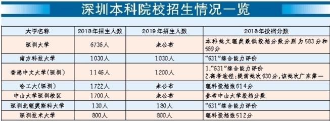 在目前已經(jīng)公布今年招生計劃的深圳高校中,深圳技術(shù)大學(xué)于2017年、2018年分別依托深圳大學(xué)招收226名及807名全日制本科生;2018年11月30日,深圳技術(shù)大學(xué)獲教育部發(fā)函正式成立,于2019年進行首年獨立招生。記者從該校獲悉,深圳技術(shù)大學(xué)今年的招生數(shù)量與去年基本持平,計劃招收6個專業(yè)11個方向的800名新生。2019年,香港中文大學(xué)(深圳)預(yù)計在全國26個省市(自治區(qū))共招收本科生1200人,相比去年稍有增加。南科大也表示,今年計劃招收本科生1030人,與2018年的招生人數(shù)相差無幾。深圳北理莫斯科大學(xué)今年將啟用永久校區(qū),招生人數(shù)從去年的130人擴大到了180人。