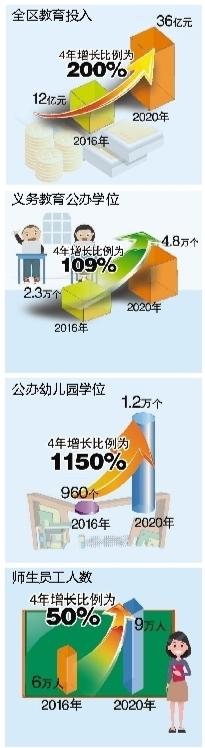 加大教育投入,教育支出增長200%;加快公辦學(xué)校和幼兒園建設(shè),公辦幼兒園從2所增加到31所,公辦園學(xué)位從960個增加到1.2萬個,增長1150%;新建、擴(kuò)建公辦中小學(xué)12所,義務(wù)教育公辦學(xué)位從2.3萬個增加到4.8萬個,增長104%。短時期內(nèi)實現(xiàn)公辦學(xué)位保障率全市遙遙領(lǐng)先。