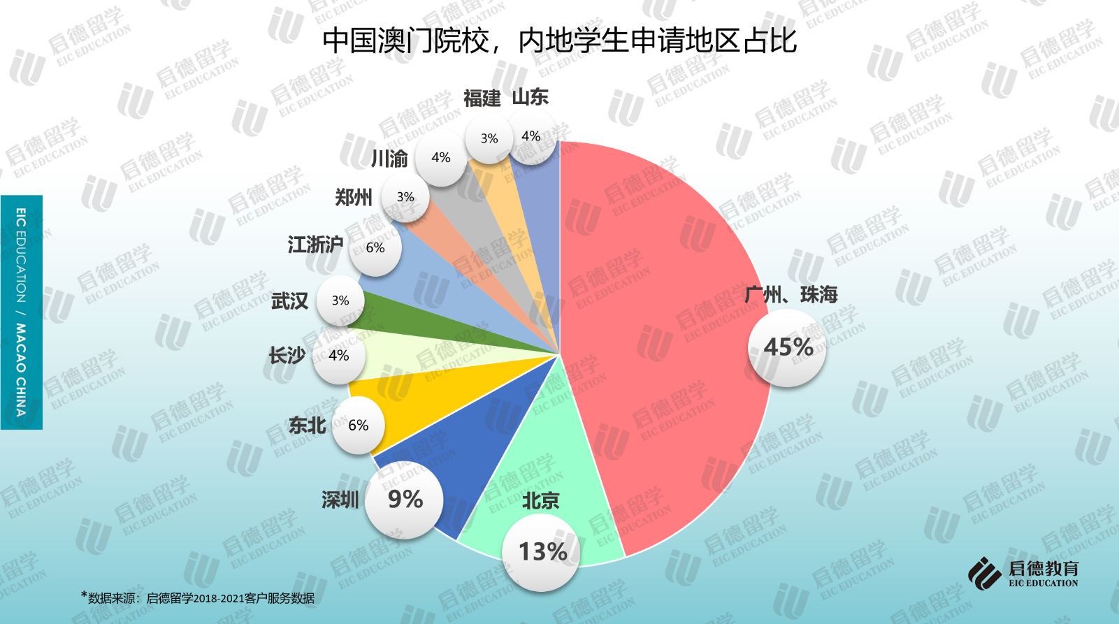 另一組啟德留學的澳門院校申請人來源數(shù)據(jù)顯示,廣東省廣州、珠海、深圳三個城市的學生申請澳門院校的占比超過50%,北京學生占比13%,分析原因,除了廣東省與澳門在文化上、生活方式上的親近性以及距離較近的優(yōu)勢外,也與澳門院校對部分區(qū)域申請人的加分政策有一定關系。如澳門大學對北京市及廣東省高考考籍的學生有加5分的優(yōu)惠政策,而對于廣東省珠海市考籍和橫琴戶籍的應屆高考生又特別優(yōu)待,實施15-20分的加分優(yōu)惠政策。