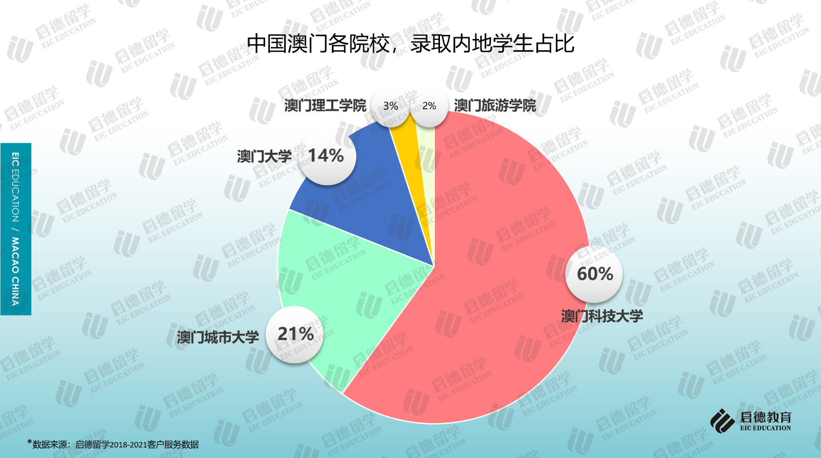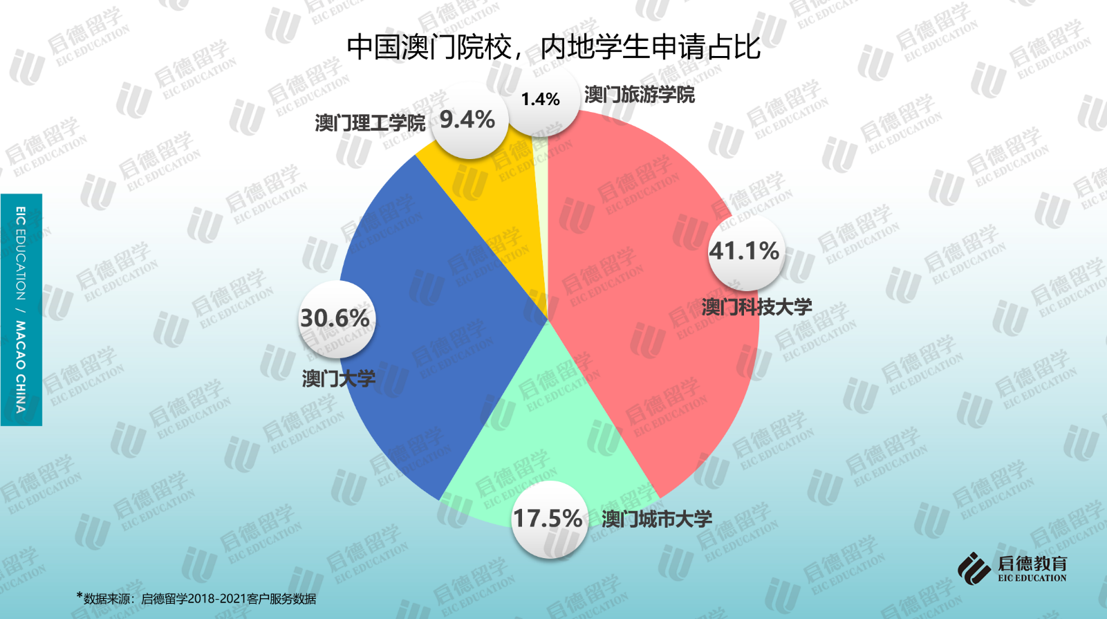 啟德留學2018-2021客戶服務數(shù)據(jù)顯示,澳門地區(qū)高校的申請中,七成以上申請澳門科技大學(41.1%)和澳門大學(30.6%);作為私立院校的澳門城市大學因?qū)W科設置比較全面,申請占比為17.5%;作為公立院校的澳門理工學院(9.4%)、澳門旅游學院(1.4%)由于專業(yè)設置較少,申請占比相對較少。從啟德留學澳門地區(qū)高校的錄取數(shù)據(jù)來看,澳門科技大學的錄取占比為60%,澳門大學的錄取占比為14%,澳門城市大學、澳門理工學院、澳門旅游學院的錄取占比分別為21%、3%與2%。