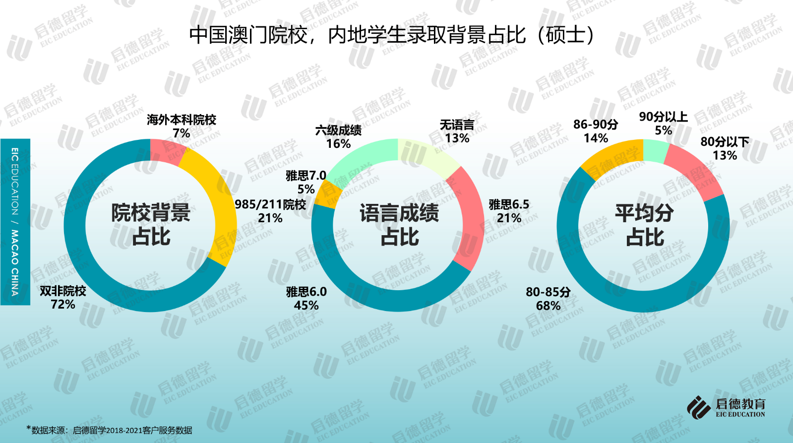 本科錄取中,澳門大學的要求較高,應屆高考生申請人高考成績要達到一本線;碩士錄取中,只有澳門大學和澳門旅游學院要求碩士申請學生提交英語成績,雅思6分為澳門大學和澳門旅游學院的語言門檻要求,澳門大學碩士申請也可接受430分以上六級和TEM4/8成績;其它院校的大多數(shù)專業(yè)對英語成績無硬性要求。啟德留學2018-2021客戶服務數(shù)據(jù)顯示,2021年碩士錄取學生中,45%達到雅思6分的門檻成績,雅思成績6.5分以上達到26%,16%的學生只提供了合格的六級成績,13%為無語言錄取;七成以上的碩士錄取學生來自雙非院校;GPA在80分以上的占比為87%。