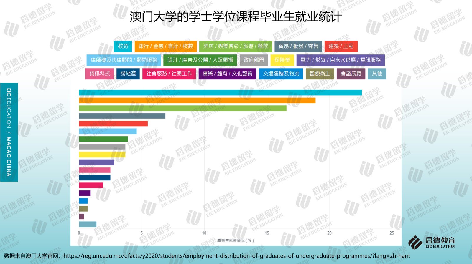澳門大學2019/2020年本科畢業(yè)生就業(yè)調(diào)查顯示,畢業(yè)生就業(yè)人數(shù)最多的行業(yè)排名前三位為教育行業(yè)(22.6%)、銀行/金融/會計/核數(shù)(18.9%)、酒店/娛樂博彩/旅游/餐飲(16.6%)。澳門科技大學2018/2019學年本科畢業(yè)后去向調(diào)查顯示,就業(yè)的本地生中,4.2%選擇在內(nèi)地工作;就業(yè)的非本地生中,在粵港澳大灣區(qū)工作的約占54.3%。本科升學后去向調(diào)研顯示,除了中國澳門(25.1%)外,英國(31.9%)、澳大利亞(15.8%)、中國香港(7.5%)、美國(5.7%)、新加坡(3.6%)也是主要升學地區(qū)。