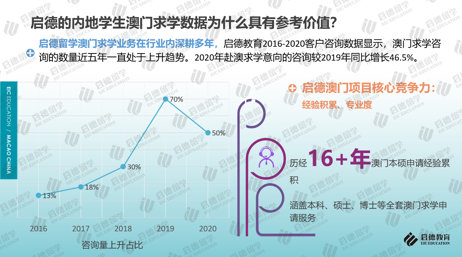 啟德留學2016-2020客戶服務數(shù)據(jù)顯示,澳門求學咨詢量近五年一直處于上升趨勢,2020年咨詢量較2019年同比增長46.5%。2021年10月31日,啟德留學在北京發(fā)布《2021中國澳門求學報告》,這也是行業(yè)內(nèi)首次針對中國內(nèi)地學生赴澳門求學情況進行的梳理與分析,《報告》結(jié)合澳門高校官方數(shù)據(jù)及最近四年啟德學生澳門求學申請與錄取數(shù)據(jù),重點分析了澳門求學的申請要求與錄取趨勢、澳門六大高校的特色與優(yōu)勢專業(yè)、澳門本地就業(yè)情況,并就赴澳門求學規(guī)劃、申請準備及求職就業(yè)等方面提供了建議。