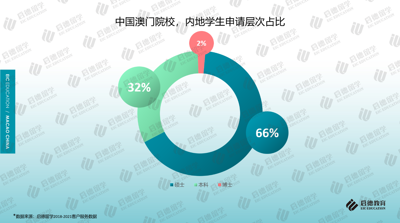 啟德留學2018-2021客戶服務數(shù)據(jù)顯示,前往澳門求學的內(nèi)地學生選擇攻讀碩士的比例較高,且申請量呈現(xiàn)逐年小幅上升的趨勢,2021年為66%;攻讀本科的占比超過30%,除高考生外,今年也開始有參加國際考試的內(nèi)地學生申請澳門的高校。QS官網(wǎng)2021年數(shù)據(jù)顯示,澳門大學非本地生(3921人)中研究生與本科生的占比分別為55%與45%;澳門科技大學非本地生(8869人)中,研究生與本科生的占比分別為32%與68%。