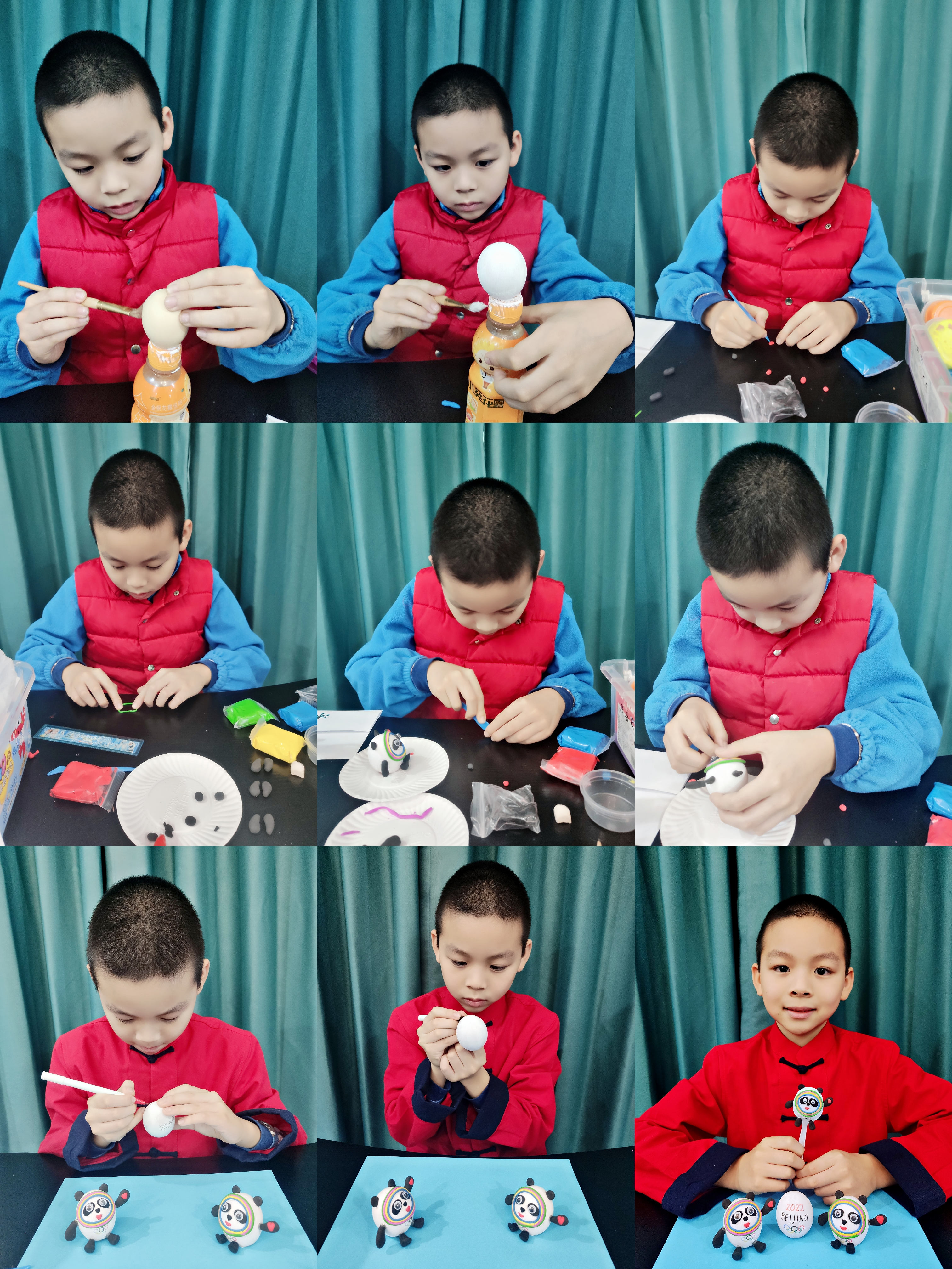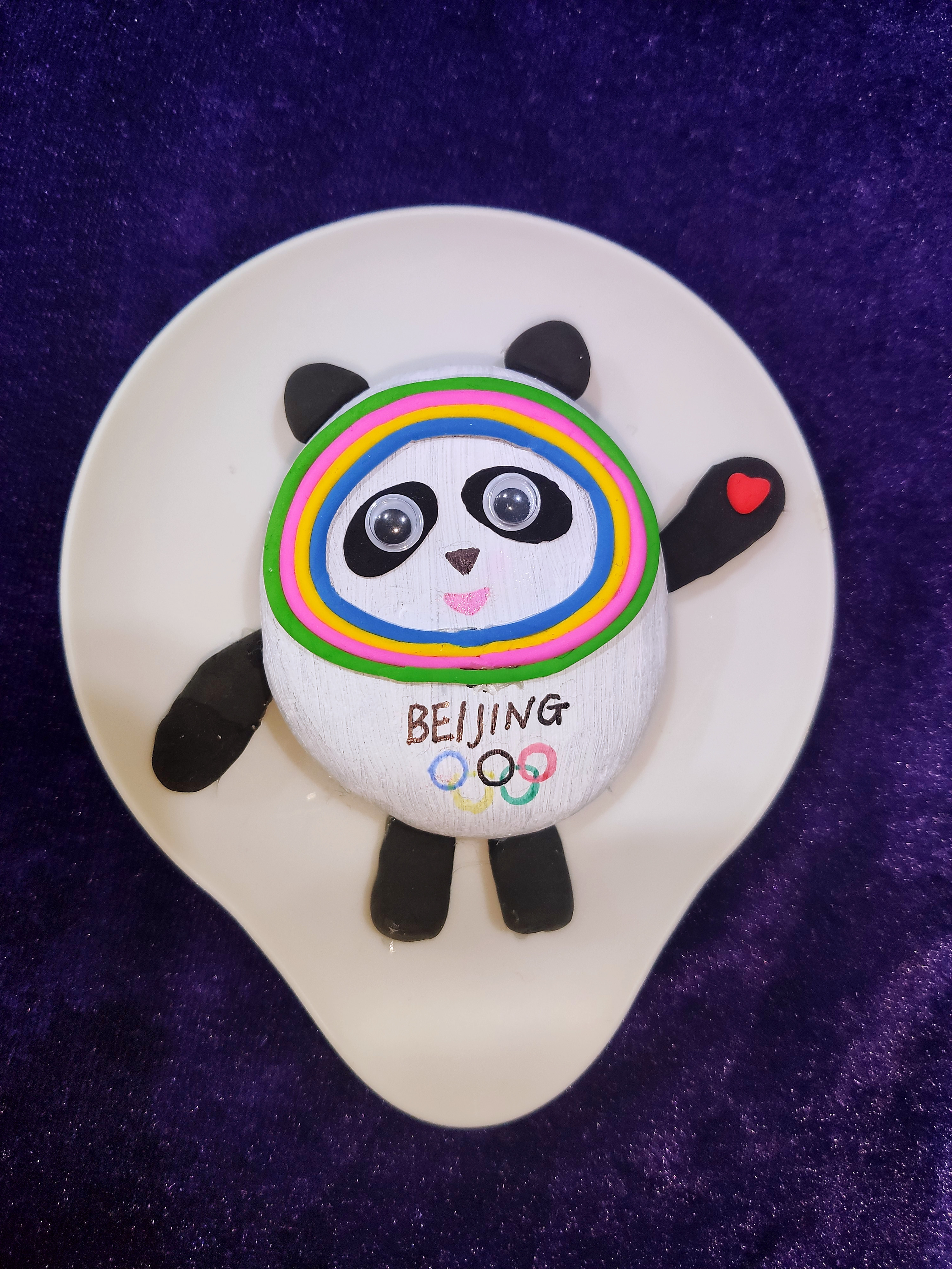 為了不讓蛋殼滾來滾去,我把蛋殼套到了瓶子上,第一步是給蛋殼刷上白色的顏料,晾干,再用輕黏土制作冰墩墩的五官和四肢。制作過程中,我遇到了難題——冰墩墩臉上的彩色光環(huán)可怎么做?我到到網(wǎng)上仔仔細(xì)細(xì)地觀察了冰墩墩的光環(huán),想到了解決辦法,最后我的蛋殼冰墩墩做好了。