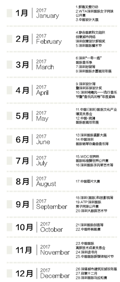 往細(xì)里說,“城市文化菜單”呈現(xiàn)出鮮明亮點(diǎn):一是國際化程度高。大部分活動(dòng)都有國際權(quán)威和國家級(jí)專業(yè)機(jī)構(gòu)主辦或授權(quán)支持,不少活動(dòng)代表了我國這一領(lǐng)域的最高水準(zhǔn),是可以代表深圳國際化城市形象的“文化大餐”。二是內(nèi)容豐富多彩。這份“菜單”表面上看只有28項(xiàng),實(shí)際上每項(xiàng)活動(dòng)時(shí)間跨度從幾天到一個(gè)多月不等,由十?dāng)?shù)項(xiàng)甚至上百項(xiàng)活動(dòng)組成,各款“菜式”都有,不同口味的人都可以自行“看單點(diǎn)菜”。三是體現(xiàn)深圳特色?!安藛巍敝杏腥种坏幕顒?dòng)與創(chuàng)新創(chuàng)意有關(guān),正好體現(xiàn)了深圳“創(chuàng)新之城”、“設(shè)計(jì)之都”的城市特性,可謂是深圳的文化“特產(chǎn)”。四是新的品牌活動(dòng)首次集體亮相。經(jīng)過多年培育,深圳已經(jīng)擁有文博會(huì)、高交會(huì)、讀書月、創(chuàng)意12月等傳統(tǒng)品牌活動(dòng),接下來還要精心打造一系列新的文化品牌活動(dòng)。在這份“菜單”中,2016年及今年新創(chuàng)辦的就有深圳“一帶一路”國際音樂季、深圳國際科技影視周、深圳國際攝影大展、深圳設(shè)計(jì)周、中國圖片大賽等多項(xiàng)活動(dòng),文博會(huì)、新春關(guān)愛行動(dòng)、國際魔術(shù)節(jié)等老牌活動(dòng)也都將有新的策劃、新的提升,更具國際化內(nèi)涵。一句話,這份菜單共匯集了國際化、標(biāo)志性的品牌文化活動(dòng)28項(xiàng),涵蓋文化藝術(shù)、創(chuàng)意設(shè)計(jì)、科技創(chuàng)新、體育休閑等多個(gè)類別,是廣義的文化活動(dòng)的概念。