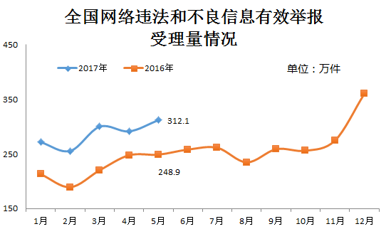 5月份,各地網(wǎng)信辦各網(wǎng)站深入貫徹落實2017年全國網(wǎng)絡(luò)舉報工作會議暨第三批百家網(wǎng)站公布舉報受理方式會議精神,同時在“六一”國際兒童節(jié)到來前,進一步加大對網(wǎng)上違法和不良信息,特別是淫穢色情等嚴重危害青少年身心健康有害信息的處置力度,受理違法和不良信息有效舉報312.1萬件,環(huán)比、同比分別增長約7.1%和25.4%。