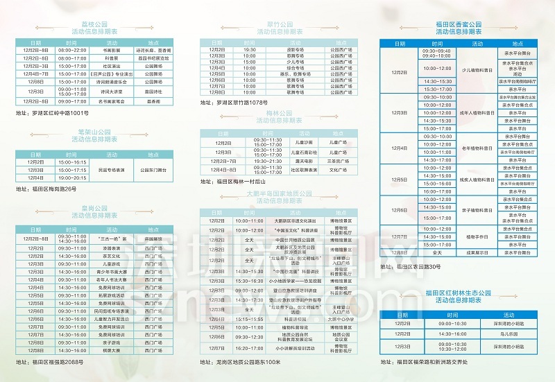 本屆公園文化周共設27個會場,其中市屬公園設11個會場,區(qū)屬公園設16個會場,這也是公園文化周自舉辦以來承辦會場最多的一屆。其中,福田區(qū)首次參與公園文化周,該區(qū)紅樹林生態(tài)公園以及今年新開放的香蜜公園均參與了本次活動。此外,坪山區(qū)的聚龍山生態(tài)公園,龍華區(qū)的龍華人民廣場、觀瀾人民公園、龍華公園、德逸公園、勞動者廣場均是首次參與“公園文化周”的承辦,讓更多市民在家旁邊就感受到公園文化和公園的建設成果。