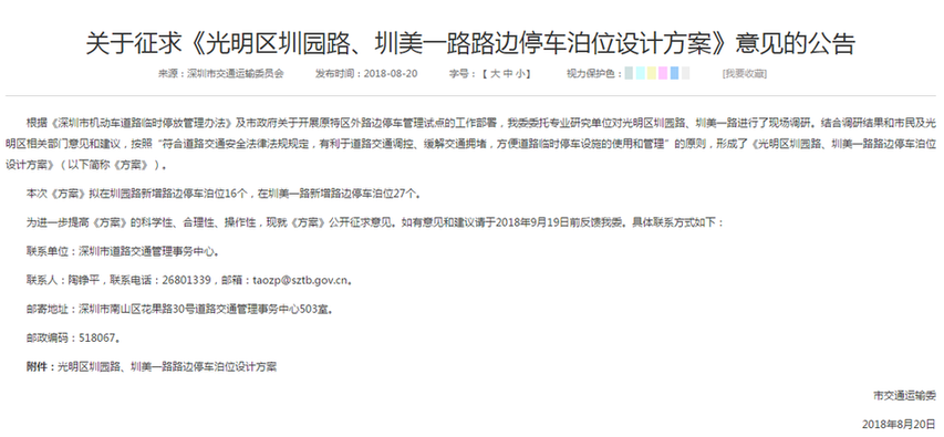 據(jù)介紹,根據(jù)《深圳市機(jī)動(dòng)車道路臨時(shí)停放管理辦法》,按照“符合道路交通安全法律法規(guī)規(guī)定,有利于道路交通調(diào)控、緩解交通擁堵,方便道路臨時(shí)停車設(shè)施的使用和管理”的原則,交通部門制定了《光明新區(qū)圳園路、圳美一路路邊停車泊位設(shè)計(jì)方案》,擬在圳園路新增路邊停車泊位16個(gè),在圳美一路新增路邊停車泊位27個(gè)。