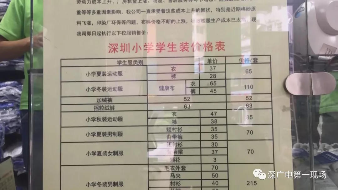 記者了解到,2011年,深圳校服曾進行過調(diào)價,當時教育部門發(fā)布通告稱,由于廠家成本上升,校服價格統(tǒng)一調(diào)整,平均價格比之前高出14.02%。之后,這一價格標準一直沿用。