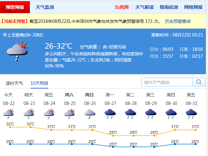 深圳新聞網(wǎng)訊 灰霾、陣雨齊上陣。多云仍是今日天氣的主格調(diào),午后還會(huì)出現(xiàn)短時(shí)陣雨或雷雨。部分時(shí)間仍有輕度到中度灰霾,能見度下降至10公里以內(nèi)。氣溫依舊較高,最低氣溫在26℃左右,最高氣溫升至32℃左右,市民應(yīng)注意防暑降溫。