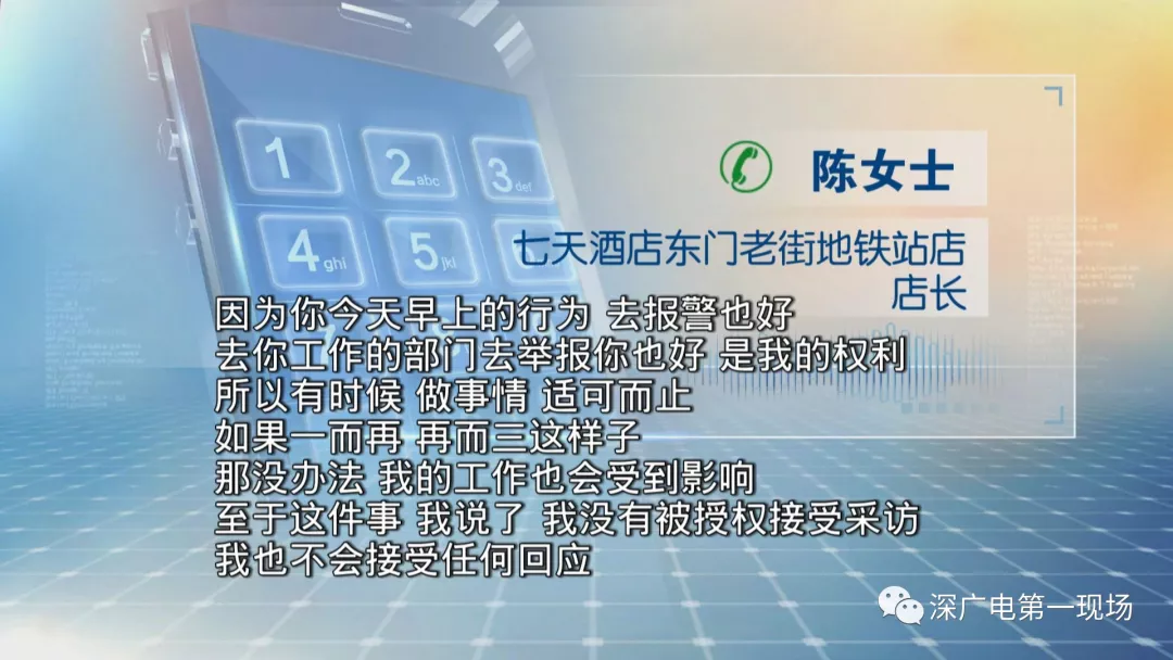 記者又聯(lián)系到了7天酒店?yáng)|門(mén)老街地鐵站店長(zhǎng)陳女士,同樣沒(méi)有得到正面的回復(fù)。