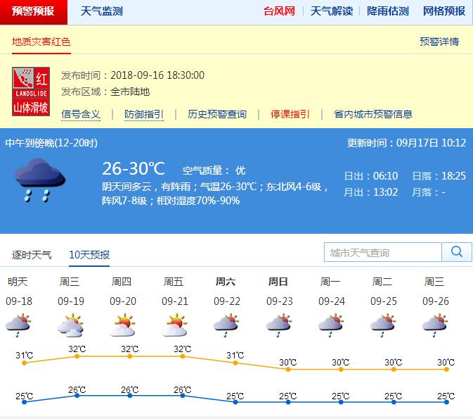 【深圳天氣趨勢】17日仍有間歇性陣雨,部分時間雨勢較大;18日多云有陣雨;19-21日,多云為主,局部地區(qū)有短時陣雨。今年第22號臺風“山竹”(熱帶風暴級)17日10時位于位于廣西境內,距離我市595公里,繼續(xù)遠離我市。深圳市氣象臺2018-09-1710:12:00發(fā)布。