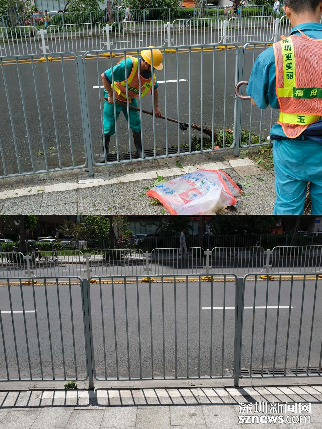 蓮花西地鐵站A出口前后對比圖(上圖:2018年9月17日,臺風(fēng)過后,路面一片狼藉,環(huán)衛(wèi)工人正在清掃。下圖 2018年9月18日下午五點(diǎn),路面清掃完畢,恢復(fù)整潔)