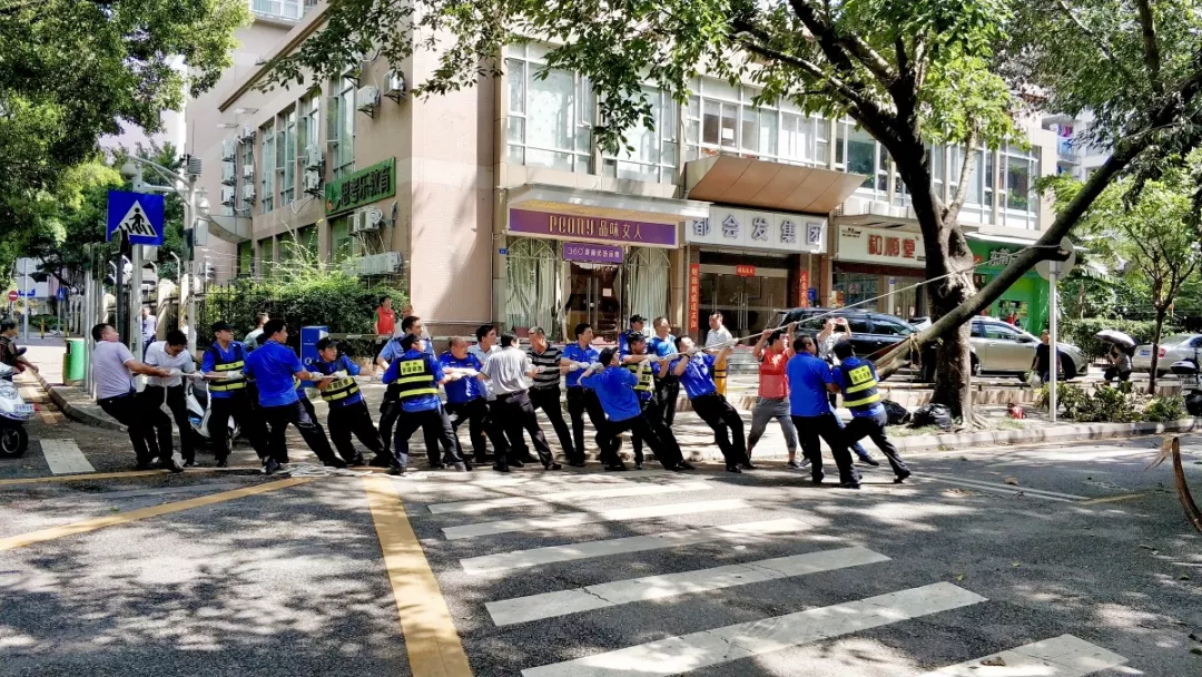 9月19日上午,福田區(qū)百花二路、三路,60多名身著藍色制服的警察和紅色馬甲的輔警格外顯眼,他們正在揮汗如雨地進行災后路障清理工作。
