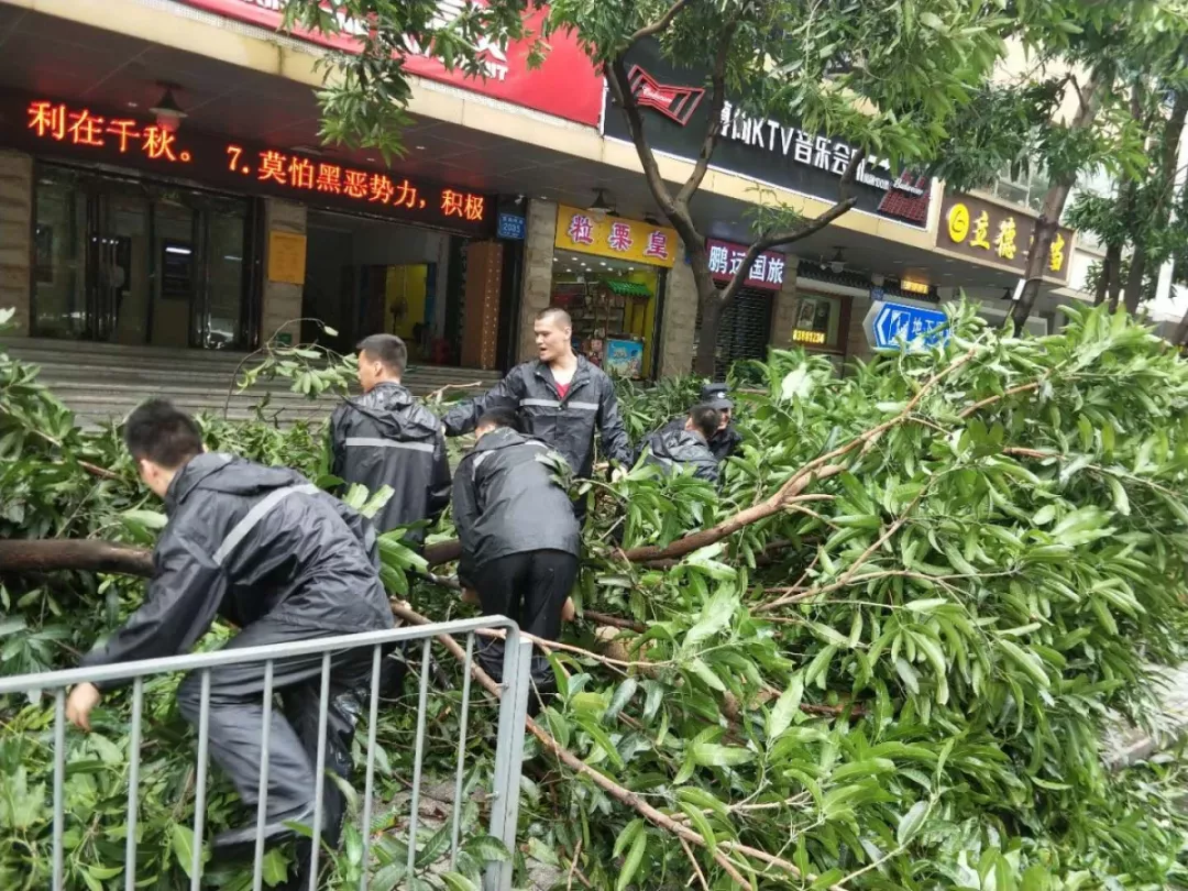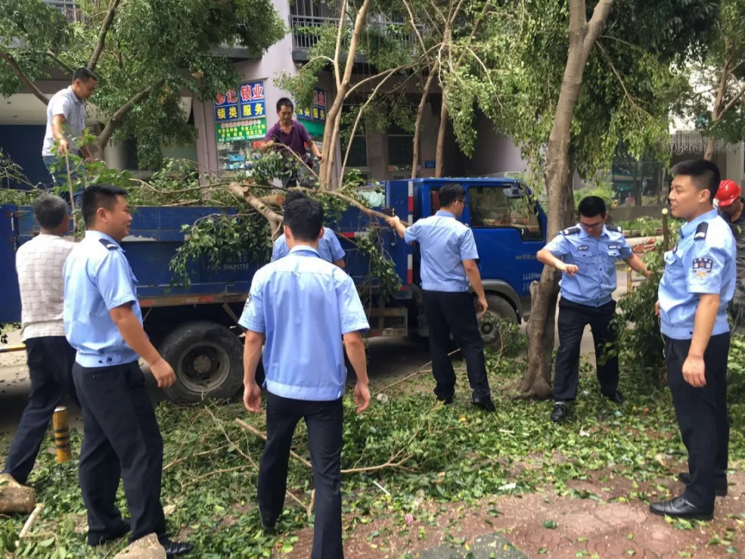 9月19日上午,福田區(qū)百花二路、三路,60多名身著藍(lán)色制服的警察和紅色馬甲的輔警格外顯眼,他們正在揮汗如雨地進(jìn)行災(zāi)后路障清理工作。