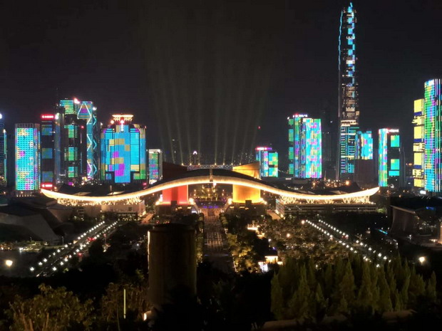這臺(tái)別開生面的晚會(huì),主舞臺(tái)設(shè)在市民中心廣場(chǎng),舞臺(tái)后方呈現(xiàn)著深圳市精心打造的福田中心區(qū)43座樓宇燈光秀,五彩斑斕、綺麗多姿的深圳城市新夜景,與晚會(huì)現(xiàn)場(chǎng)舞臺(tái)融為一體,為市民和廣大觀眾呈現(xiàn)出一個(gè)迷人的“深圳之夜”。