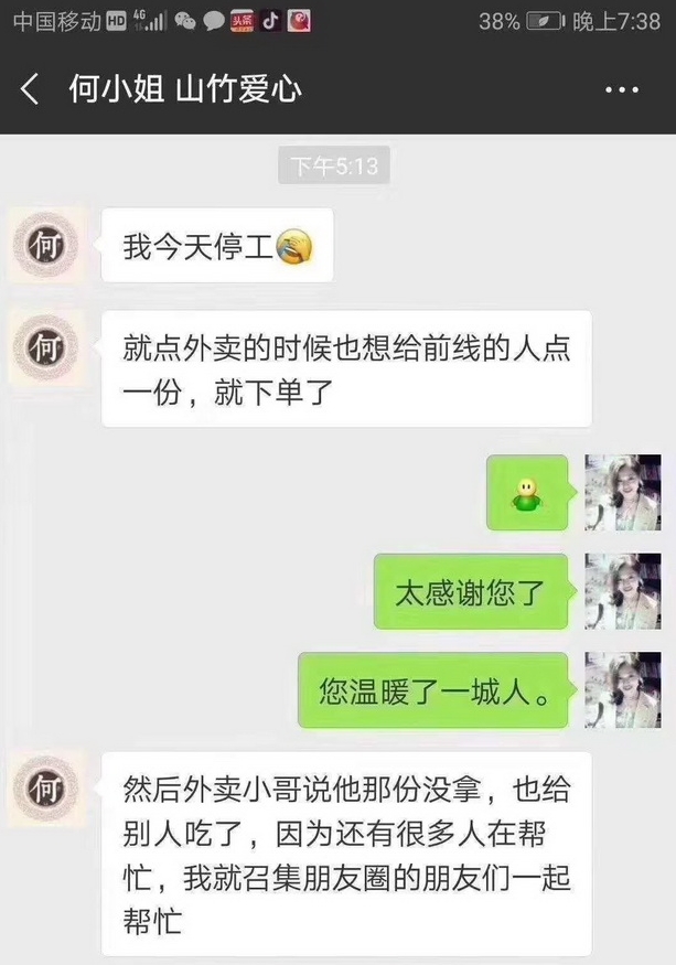 還有為這些前線工人送愛(ài)心外賣(mài)訂單的“何女士”